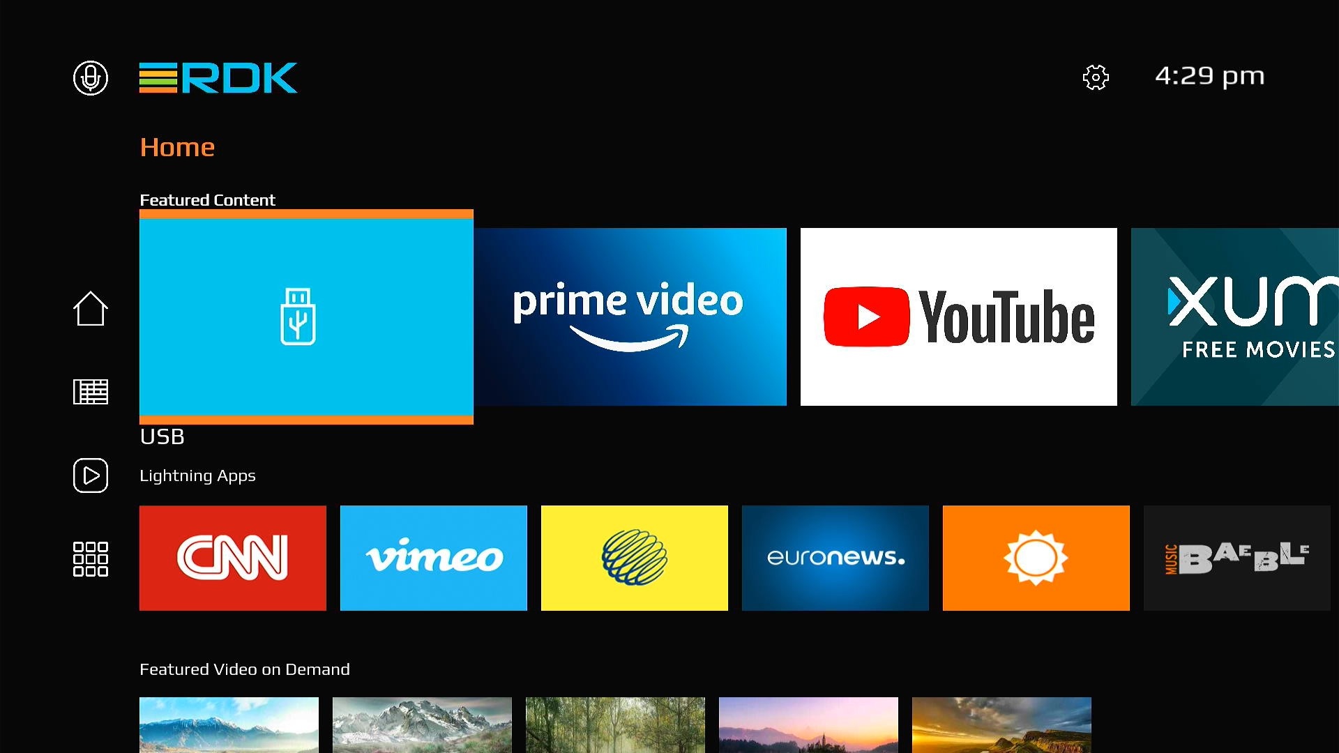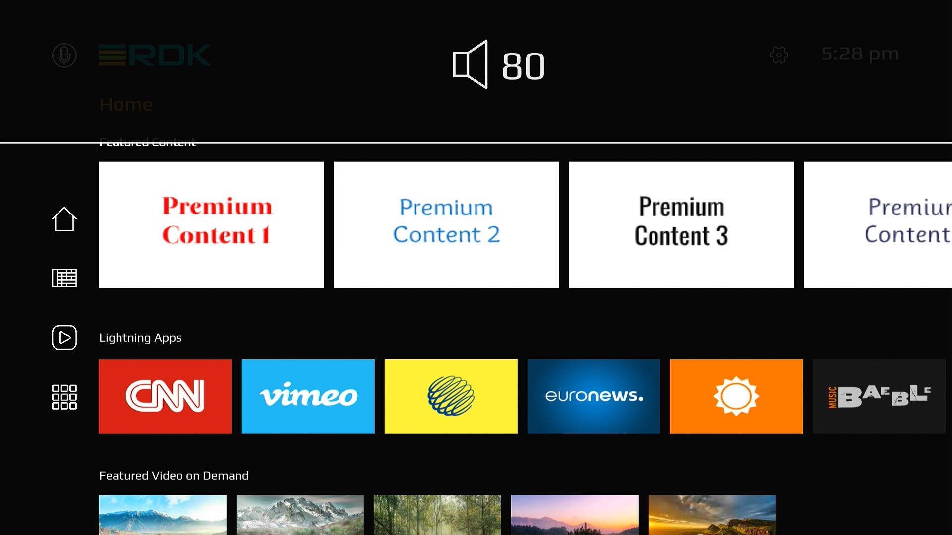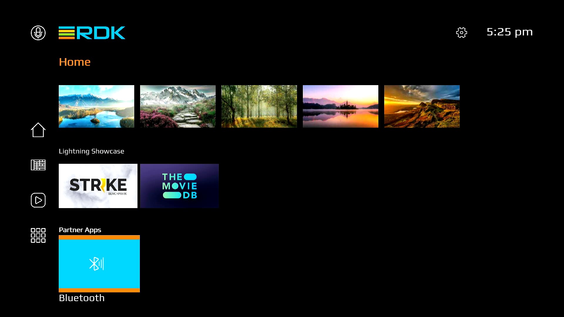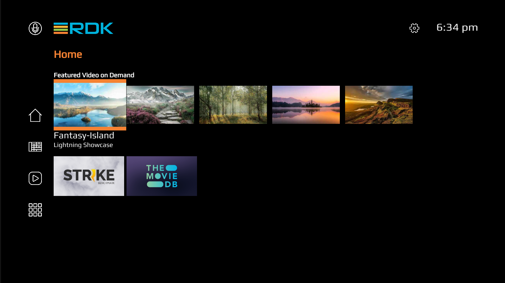The RDK Accelerator Home UI version 5 is the latest version (rdk-next/accelerator-home-ui/settings.json platformSettings version) of the RDK reference UI which provides a full featured UI with a modern minimalistic design using a dark theme.