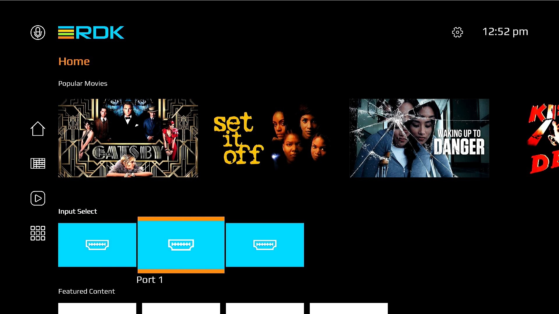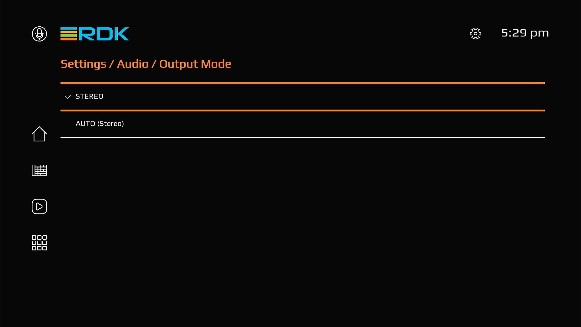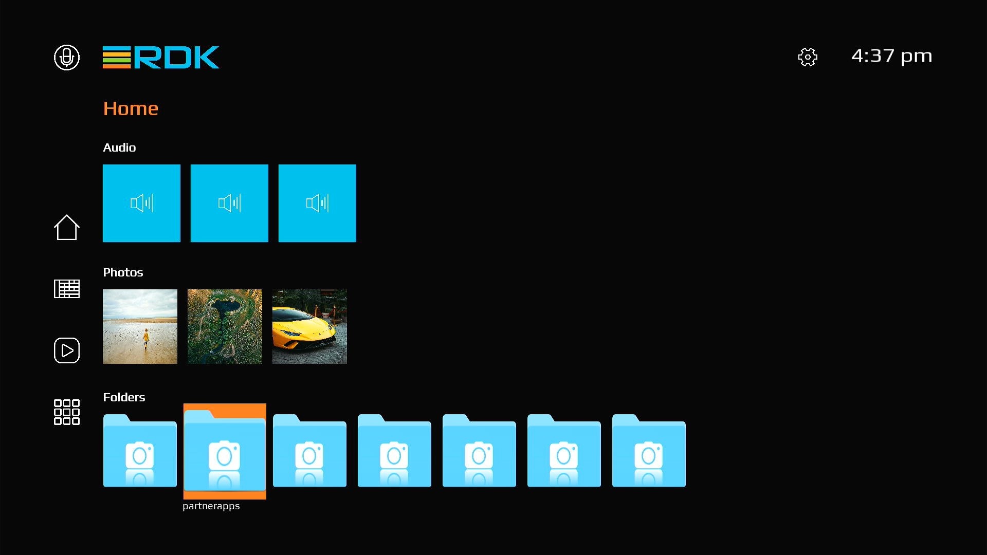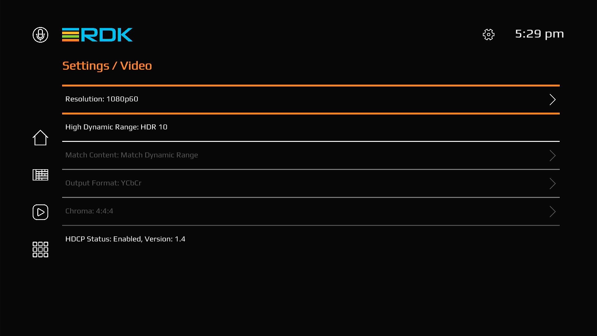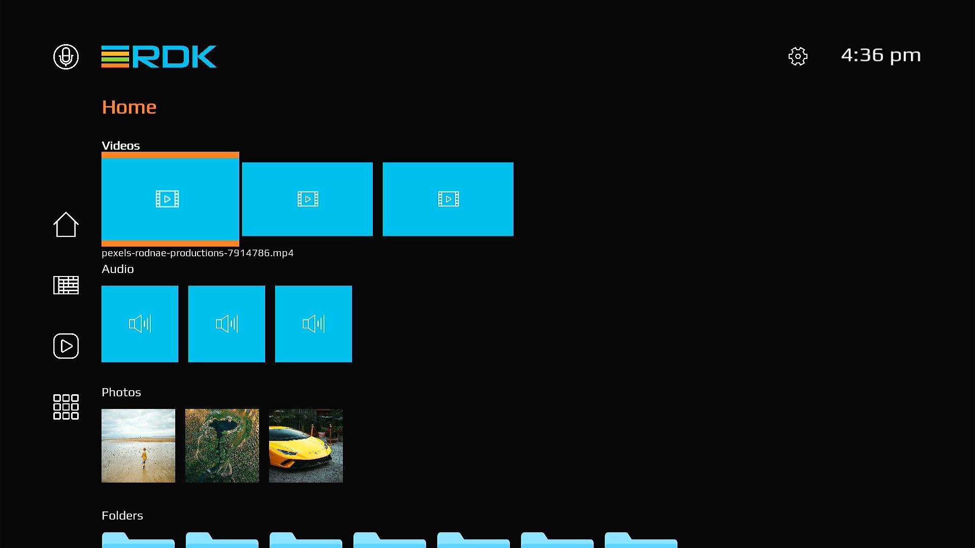 The RDK Accelerator Home UI version 5 is the latest version (rdk-next/accelerator-home-ui/settings.json platformSettings version) of the RDK reference UI which provides a full featured UI with a modern minimalistic design using a dark theme.
