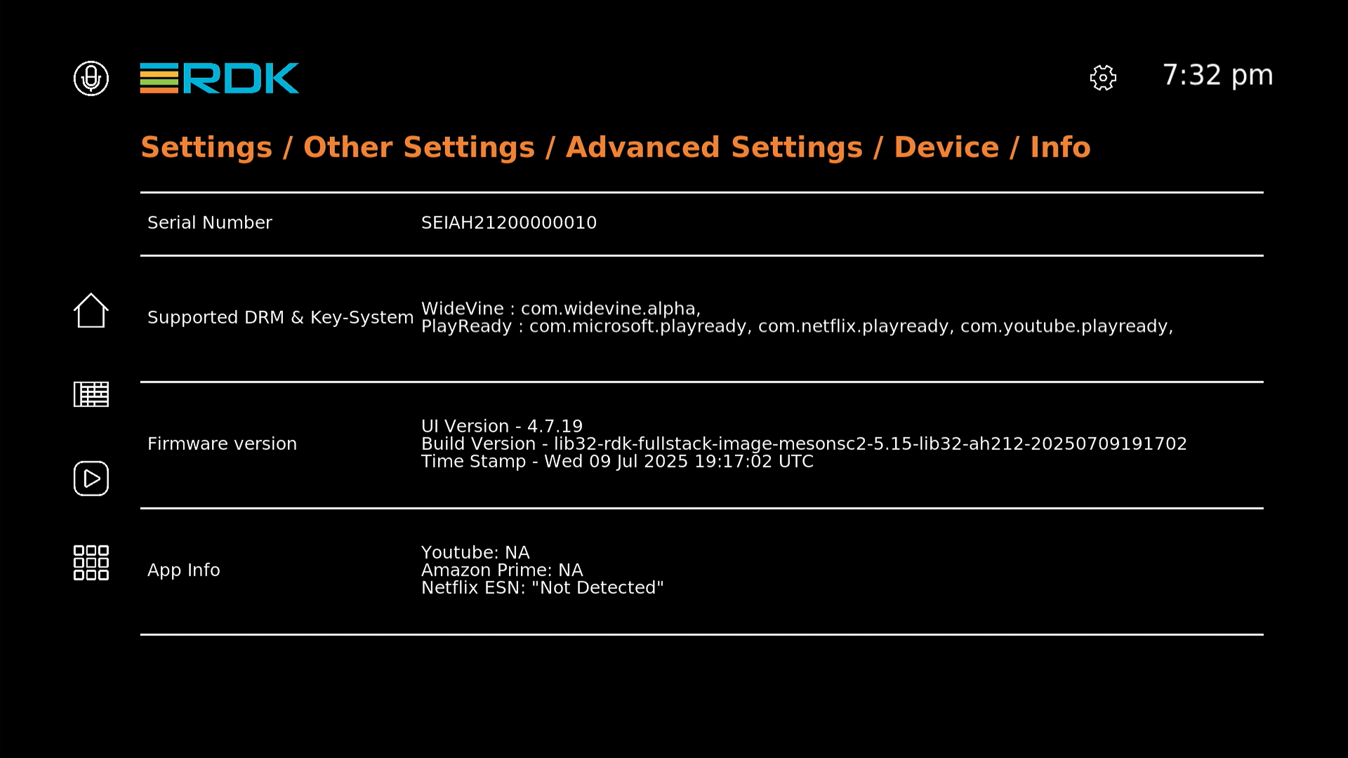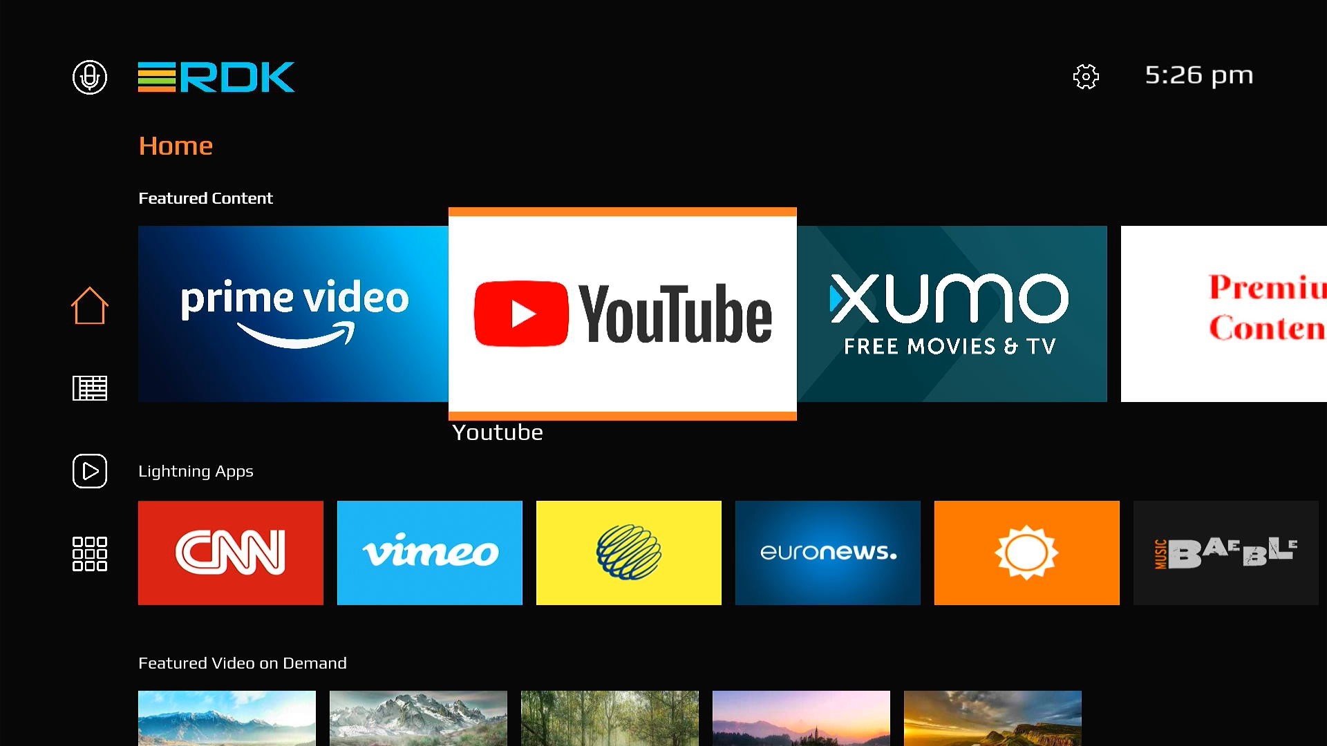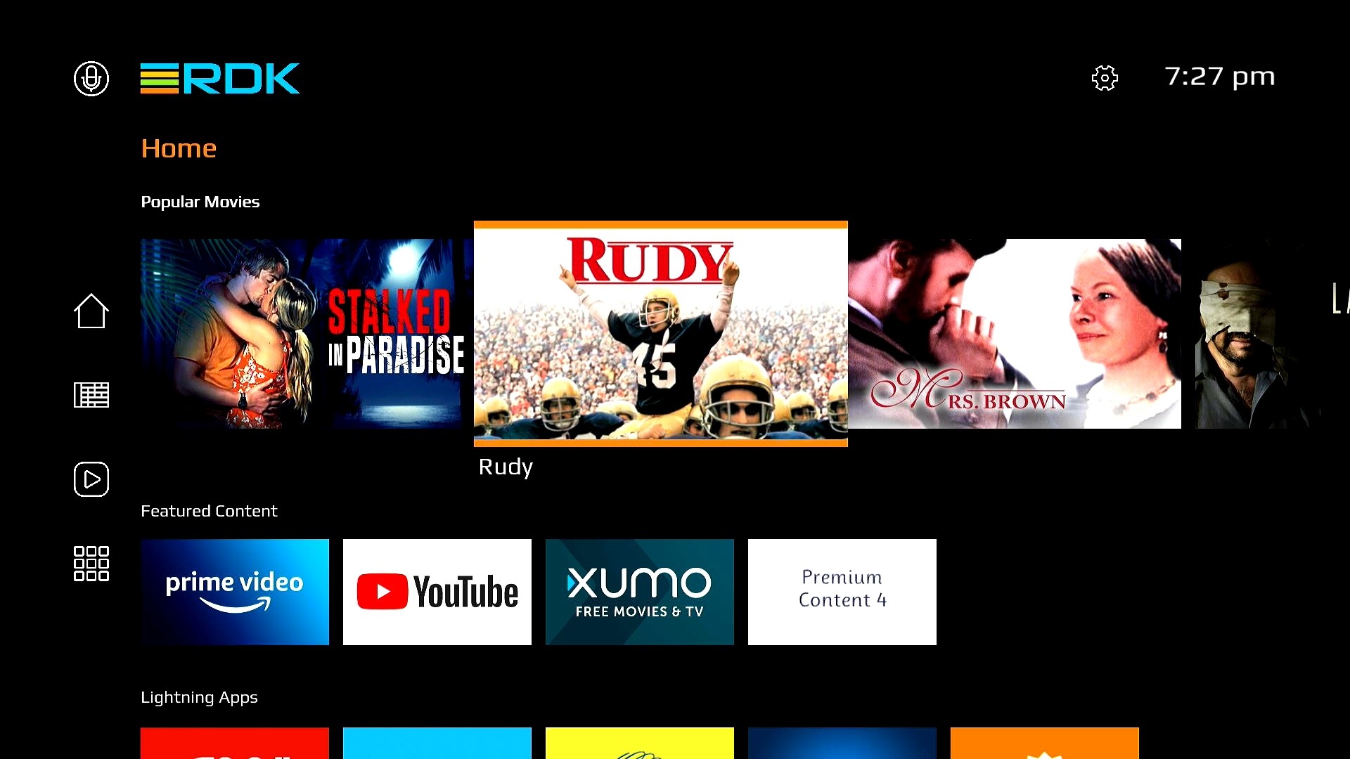 The UI uses Lightning SDK Plugins such as  Language, Router, Storage and supports Premium apps such as Amazon, YouTube, Xumo along with a selection of Lightning apps from the Metrological App Store.  It also includes a wide section of settings which allow a user to take full advantage of the device features such as Audio, Video, Network, Language and more.