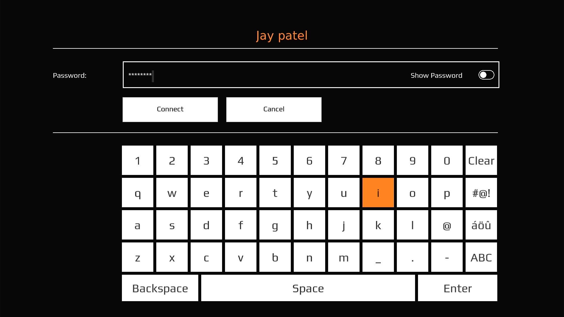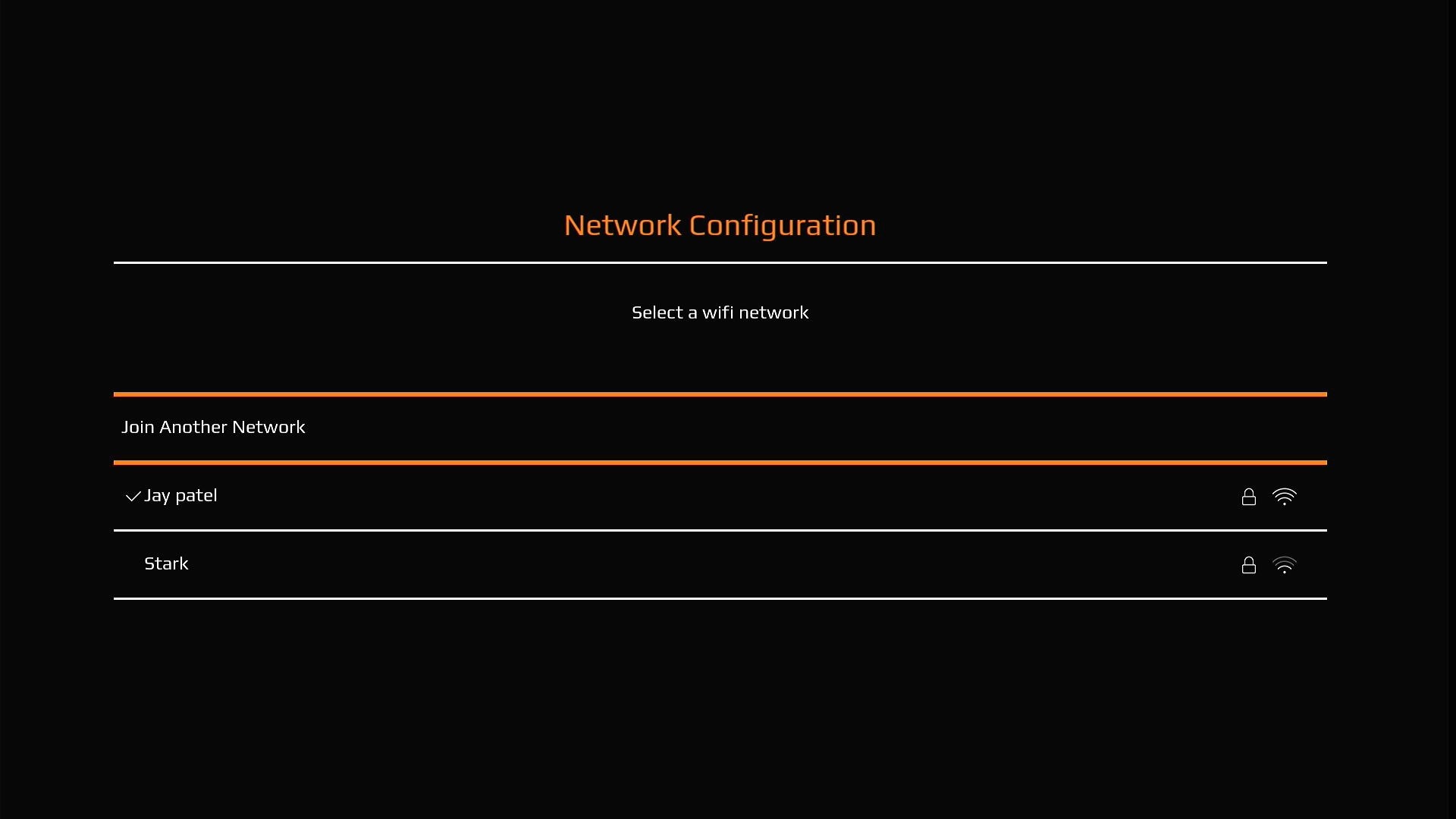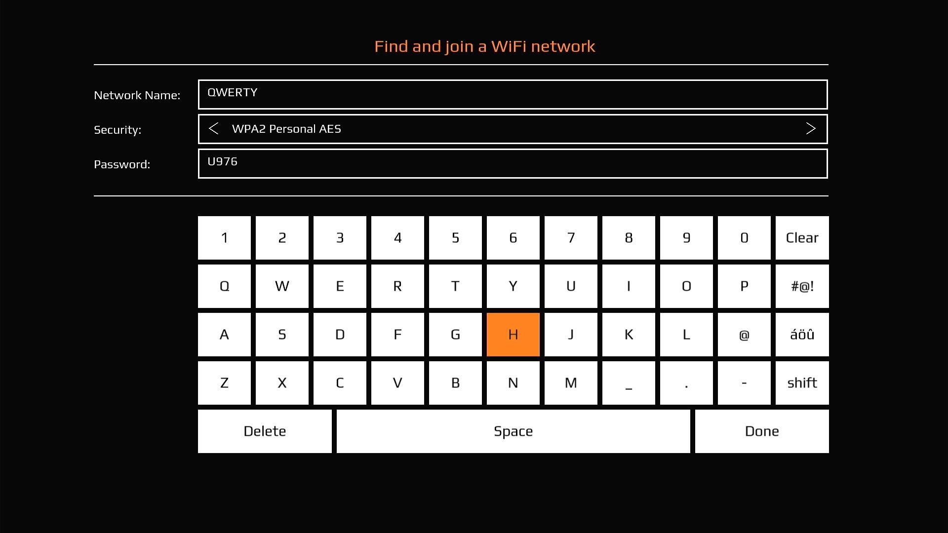 Upon selecting Wi-Fi interface, user shall be presented with a list of available wireless networks or an option to connect to the hidden network. Upon selection of a Wi-Fi network user shall be presented a page where he can enter the network credentials.