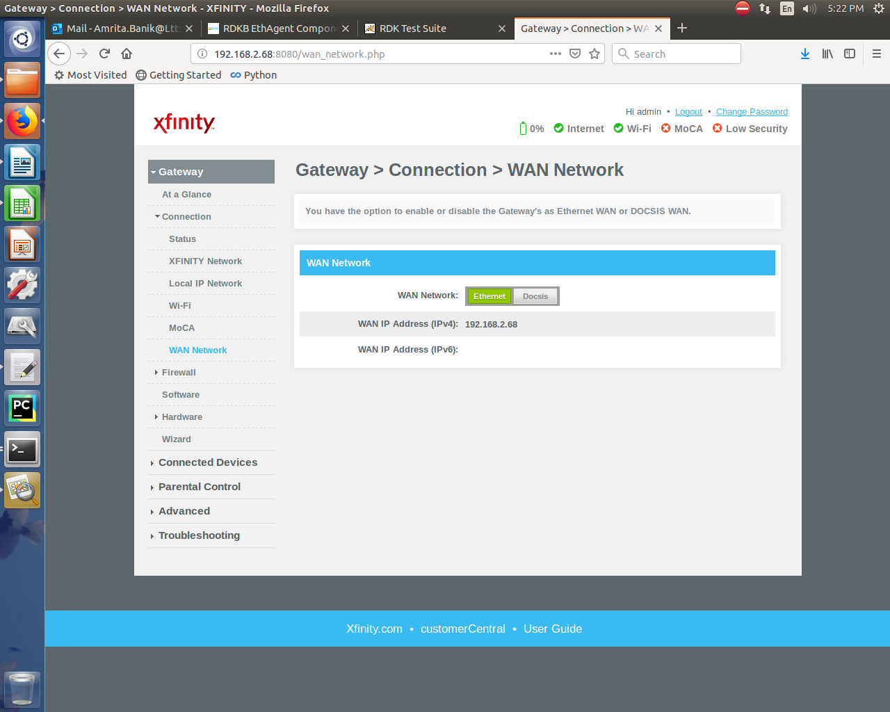 root@RaspberryPi-Gateway:~# dmcli eRT setv Device.Ethernet.X_RDKCENTRAL-COM_WAN.Enabled bool false