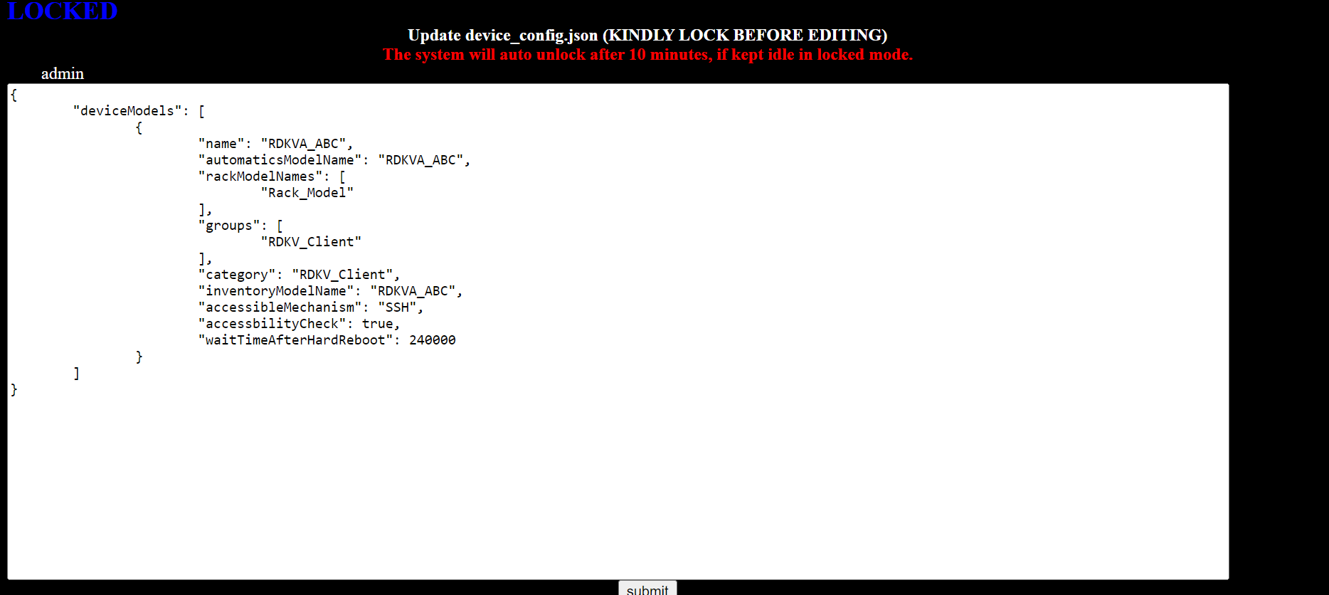 - To edit the values, please click on “unlocked” button. Update the values and click on submit. This will save the configuration values.