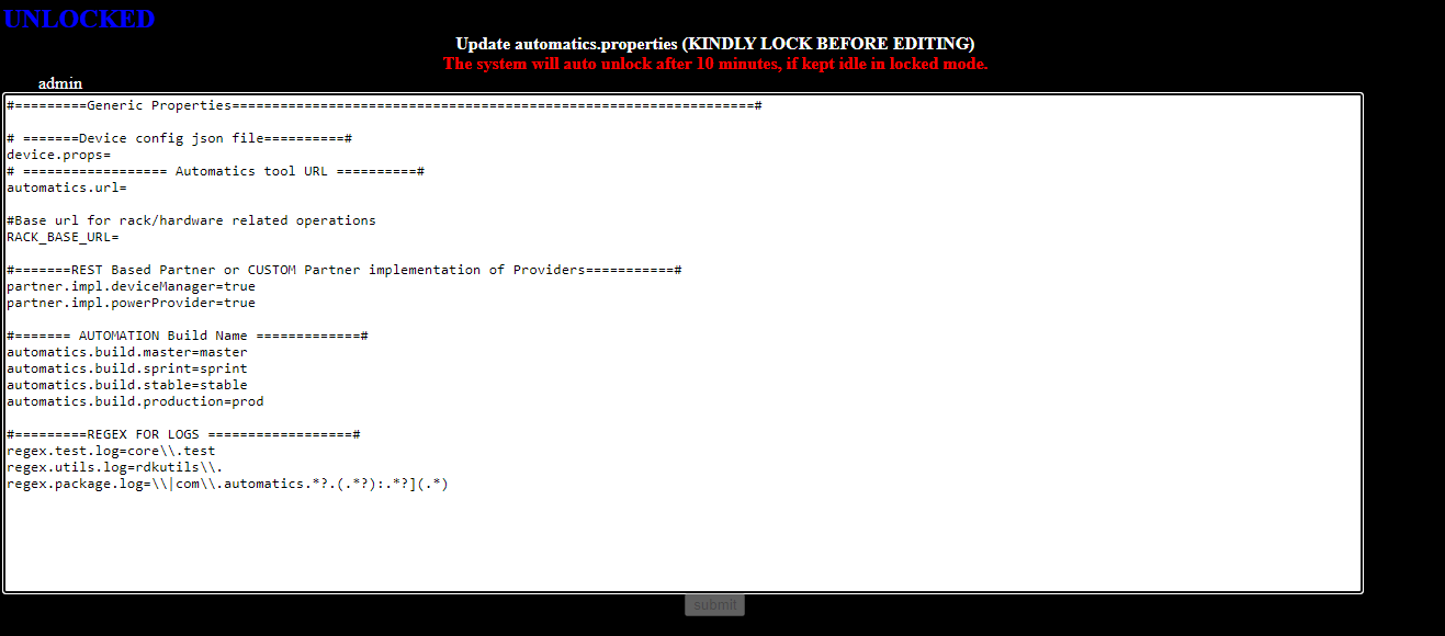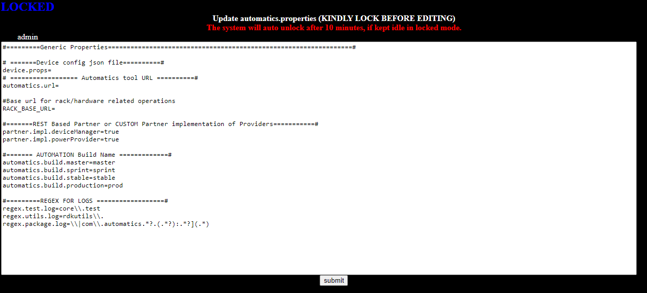 By default Automatics Properties page will be displayed after login. User can choose the file option in login page to navigate between Automatics Properties and Device Properties. Following are the default properties for automatics.properties file.